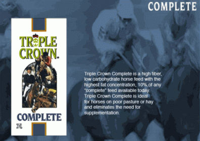 • Triple Crown Complete [12% Protein, 12% Fat, 15% Fiber]. A texturized, Complete feedwith high levels of guaranteed nutrients and additives to keep your performance horse in top form.
