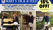 Great summer savings are in store in select departments at Mary’s Tack and Feed in Del Mar. Don’t miss out on our 10% off sale on all new Western Saddles, AND get FREE shipping from Mary’s and a FREE saddle cover with purchase! Outfit yourself for summer rides and save 15% off on all Heritage…